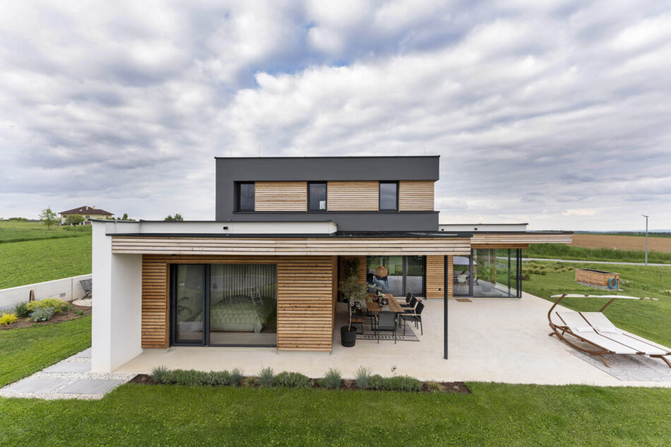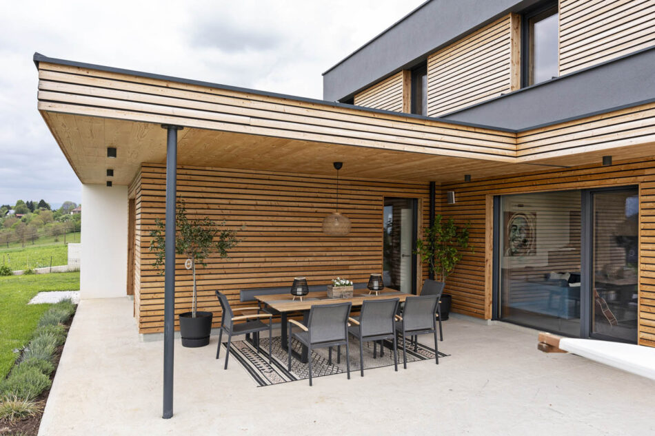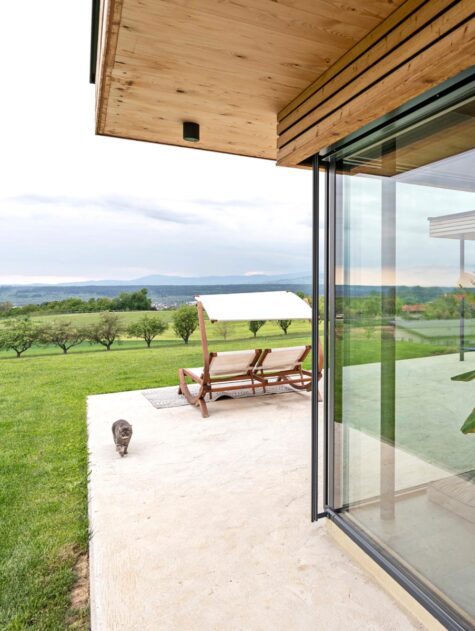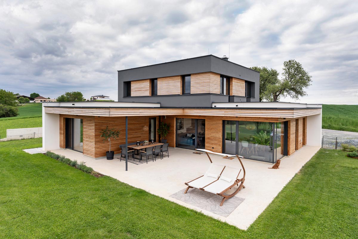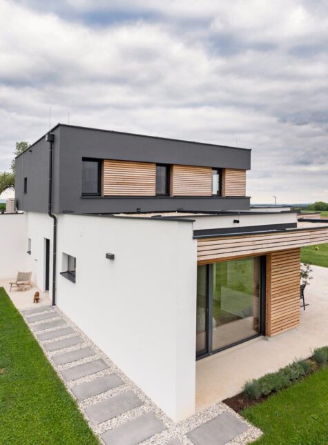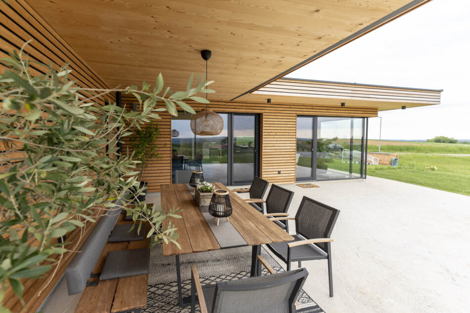 Wir haben gezielt nach einem Grundstück in unserer Gemeinde gesucht, welches sich am Westhang mit Blick auf die steirischen Ostalpen befinden sollte. Letztlich haben wir dies auch gefunden. Unser Platz liegt auf 444m Seehöhe und ist in einer etwas exponierten Hanglage, weshalb uns besonders wichtig war, dass sich unser Haus gut in die Umgebung einfügen soll. Umgekehrt wollten wir auch die Natur und den wunderbaren Ausblick, den unser Grundstück bietet, in unsere Wohnräume anhand großer Glasflächen holen. Ebenso war uns ein Anliegen auf das Verwenden von nachhaltigen Baumaterialien zu achten.