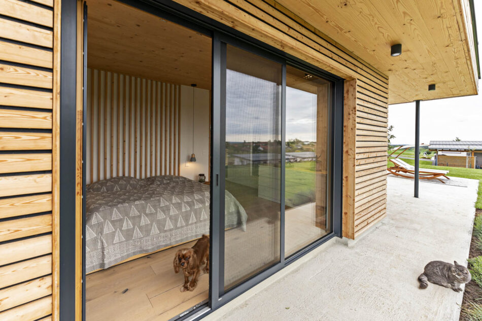 Für die Planung beauftragten wir die vm Holzarchitekten, welche unsere Vorstellungen sehr gut zu Papier brachten und uns bei der Auswahl der Baumaterialien beraten haben. Da das Haus unter Straßenniveau platzierte wurde und das kleine, aufgesetzte Obergeschoß bewusst dunkel gestrichen wurde, wirkt es optisch zurückhaltend. Zusätzlich wirkt sich auch die großflächige Lärchenschalung im Untergeschoß positiv auf das äußere Erscheinungsbild aus. Die Innenräume sind offen gestaltet und wir lieben an unserem Wohnraum besonders, dass er vom Morgen bis zum Abend mit Licht durchflutet ist. Das Elternschlafzimmer befindet sich im Untergeschoß und ermöglicht durch eine Glasfront in Richtung Westen der Sonne beim Untergang zuzuschauen. Gleich anschließend befindet sich das große Badezimmer mit integrierter Sauna. Davon ausgehend erstreckt sich ein privater Hinterhof in Richtung Norden mit einer Außendusche. Im Obergeschoß sind die beiden Kinderzimmer mit Bad und WC untergebracht sowie im offenen Stiegenhaus ein Büro geplant wurde.