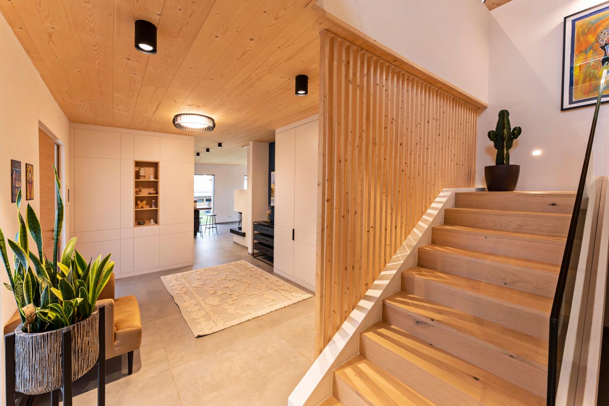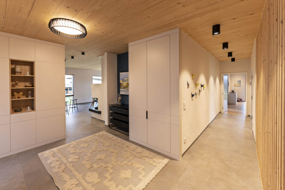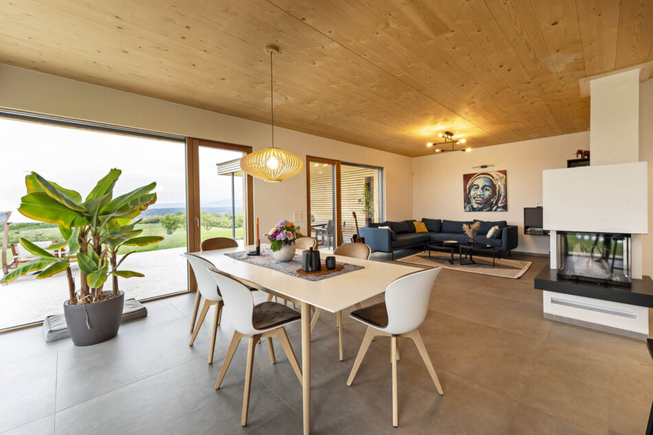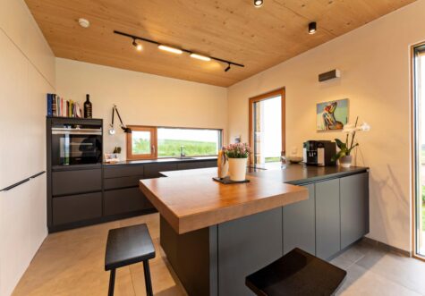Die Außenwände und manche Innenwände (Sauna, Fernsehwand) unseres Hauses bestehen aus Fichten- KLH-Platten. Für die Dämmung haben wir Zellulose verwendet und zum Putzen der Innenwände wurde ausschließlich, der im eigenen Garten abgebaute Lehm, verwendet. Die Decken beließen wir in Holzsichtoptik und auch für die Fenster wählten wir Lärche, welche außen allerdings der Witterung wegen mit Alu in anthrazit beschlagen sind. Im Erdgeschoß wurde durchgehendes Feinsteinzeug verlegt, im Obergeschoß wählten wir Eichen-Parkett. Wir sind vom angenehm warmen Raumklima besonders überzeugt und lieben den nach wie vor anhaltenden Holzgeruch.